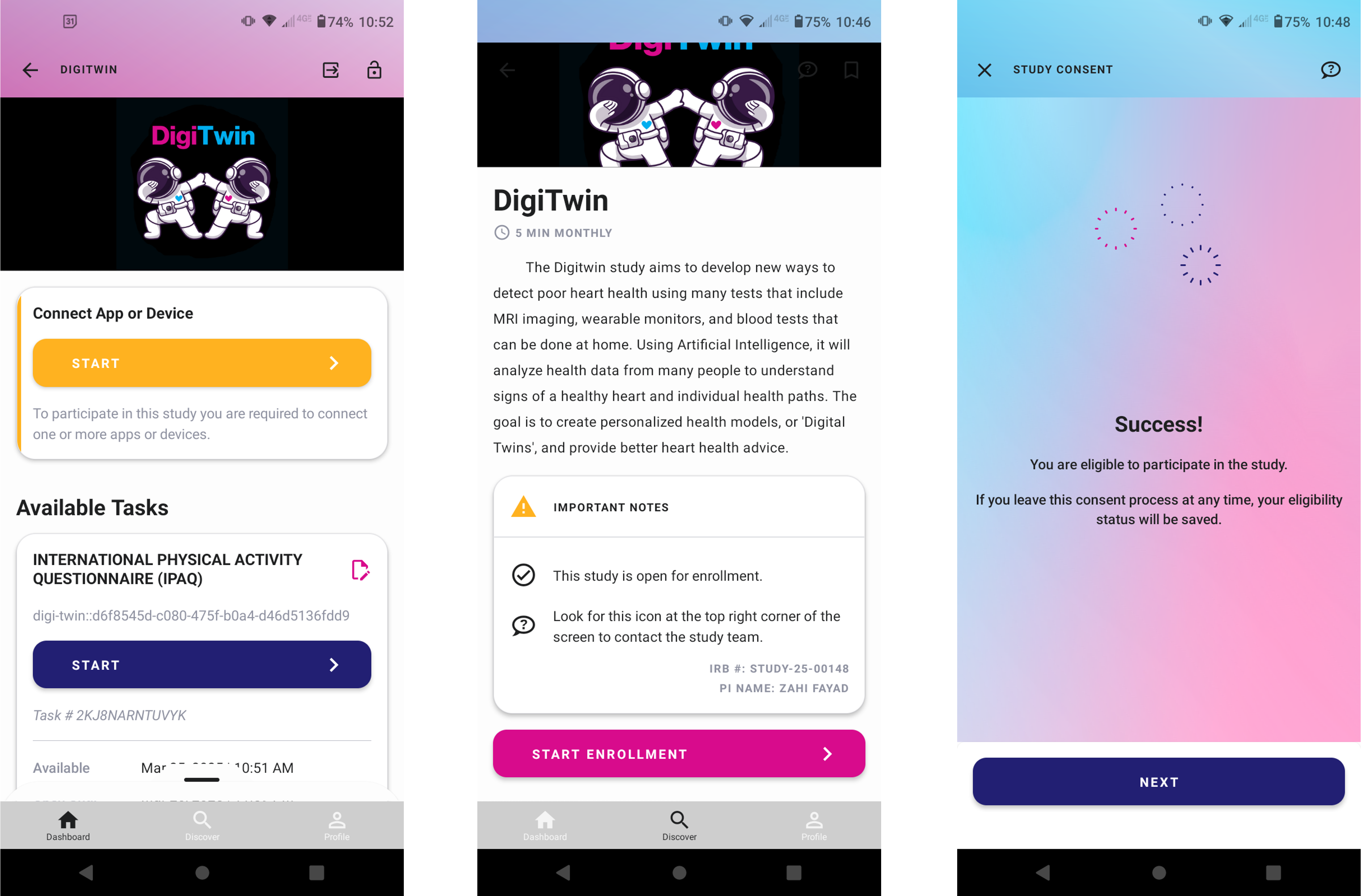 The eHive smartphone app – developed by Mount Sinai researchers – provides an intuitive and user-friendly interface for study participants to provide informed consent to participate during enrollment into the study and for collecting self-reported health and lifestyle data from in-app questionnaires during the study. The app also provides a convenient way for researchers and participants to stay in touch, answer questions, and receive reminders to complete study tests and schedule study appointments at our center in NYC. The app also connects to smart devices at home and facilitates seamless integration of study data in a secure (HIPAA compliant) database to enable researchers to develop AI/ML models.